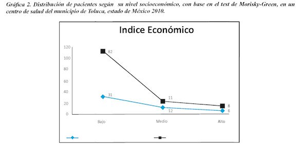 La recolección de datos fue llevada a cabo de junio a diciembre de 2010, utilizando un cuestionario con ítems para evaluar la condición económica, y elaborar el índice socioeconómico. Par a su cálculo fueron considerados tres indicadores: escolaridad, ingreso mensual y ocupación; siendo éstos ordinales, es decir, contienen tres valores que señalan un nivel socioeconómico. Se construyó el indicador uno, como el valor de nivel bajo, los pacientesm clasificados en esa categoría percibí an menos de tres salarios mí nimos mensuales, habían cursado menos de cinco grados escolares; algunos de ellos estaban desempleados, varias eran amas de casa, y otros, comerciantes ambulantes; el indicador dos se consideró como nivel medio, clasificando en esa categoría a pacientes que percibí an de cuatro a seis salarios mí nimos, contaban con seis a ocho años de escolaridad, y su ocupación era comerciante, obrero, o campesino; el indicador tres, nivel alto, lo formaban pacientes que percibían más de ocho salarios mínimos mensuales, con educación media básica y cuya ocupación era: profesor, empleado o comerciante.