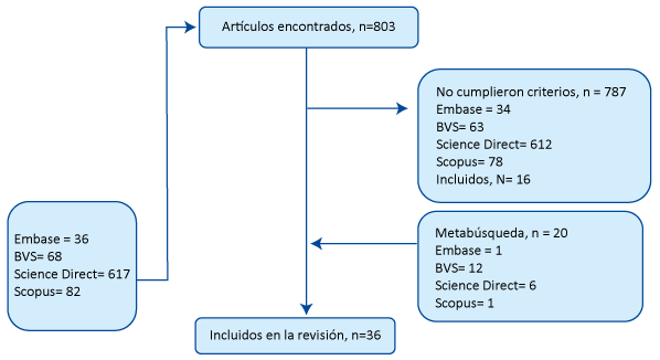 Se encontraron un total de 803 artículos con la estrategia de búsqueda definida previamente, de los cuales 787 fueron excluidos al no cumplir los criterios de inclusión o debido a que estaban duplicados en las diferentes bases de datos. Es así como 16 artículos cumplieron con los criterios de búsqueda y 20 fueron incluidos por proceso de meta búsqueda a partir de los artículos originales.