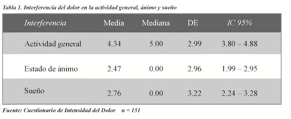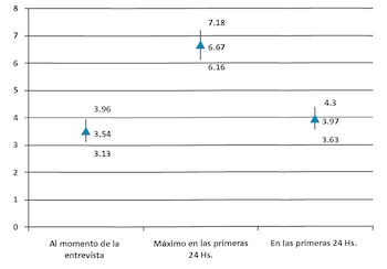 Además se preguntó acerca de la presencia de dolor y su intensidad al momento de realizar la entrevista, así como el máximo dolor y el dolor promedio en las primeras 24 horas posoperatorias; y la interferencia del dolor en actividades generales del paciente, en su estado de ánimo y en su patrón de sueño. Lo anterior se realizó con el Cuestionario de Intensidad del Dolor (24), el cual cuenta con escalas visuales con puntaje de 0 a 10, donde a mayor puntuación mayor dolor o mayor interferencia con las actividades generales. Adicionalmente se cuestiona acerca de la satisfacción del paciente con el equipo de salud respecto al manejo del dolor.
