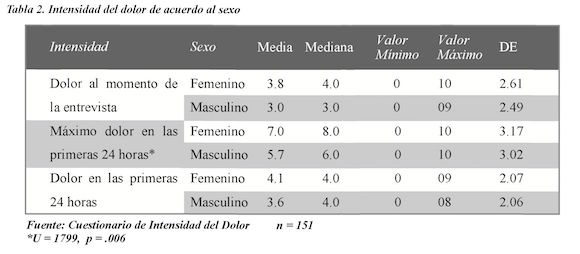La intensidad del dolor en las primeras 24 horas fue mayor en las mujeres, hallazgo que concuerda a lo reportado por algunos autores (8). Existe una tendencia a que las mujeres califiquen con una mayor intensidad el dolor promedio y el dolor al momento de la entrevista. Esto puede atribuirse a la cultura debido a que socialmente el hombre desde las etapas tempranas de la vida debe tolerar situaciones relacionadas con la experiencia de dolor y se le impide el expresarse libremente, este aspecto es diferente en las mujeres quienes pueden exteriorizar mejor sus sentimientos (28).