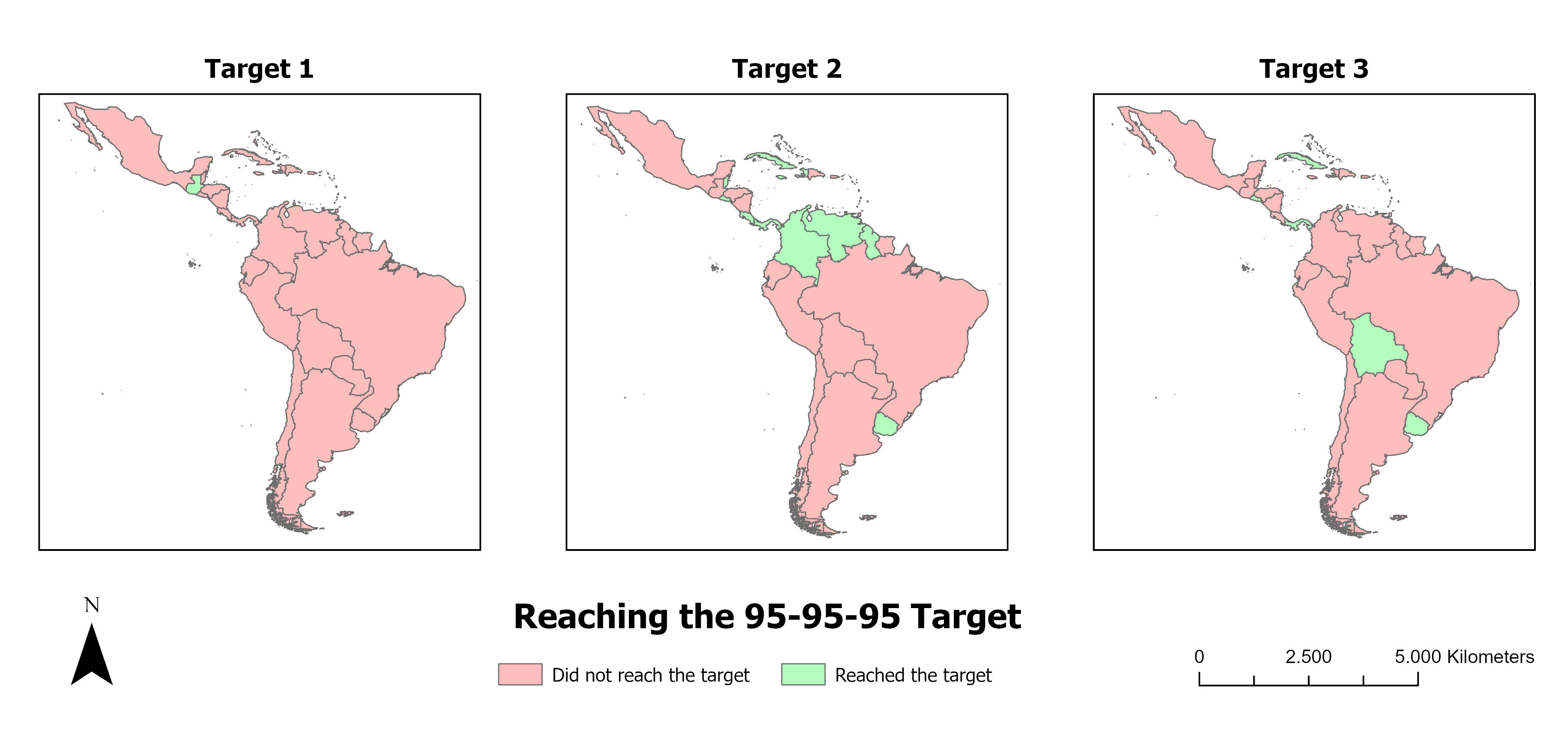The study allowed us to analyze the spatial distribution and autocorrelation of the 95-95-95 targets among children and teenagers living with HIV/AIDS in Latin American and Caribbean countries. The spatial distribution showed disparities between countries in terms of meeting and increasing the achievement of the 95-95-95 targets.