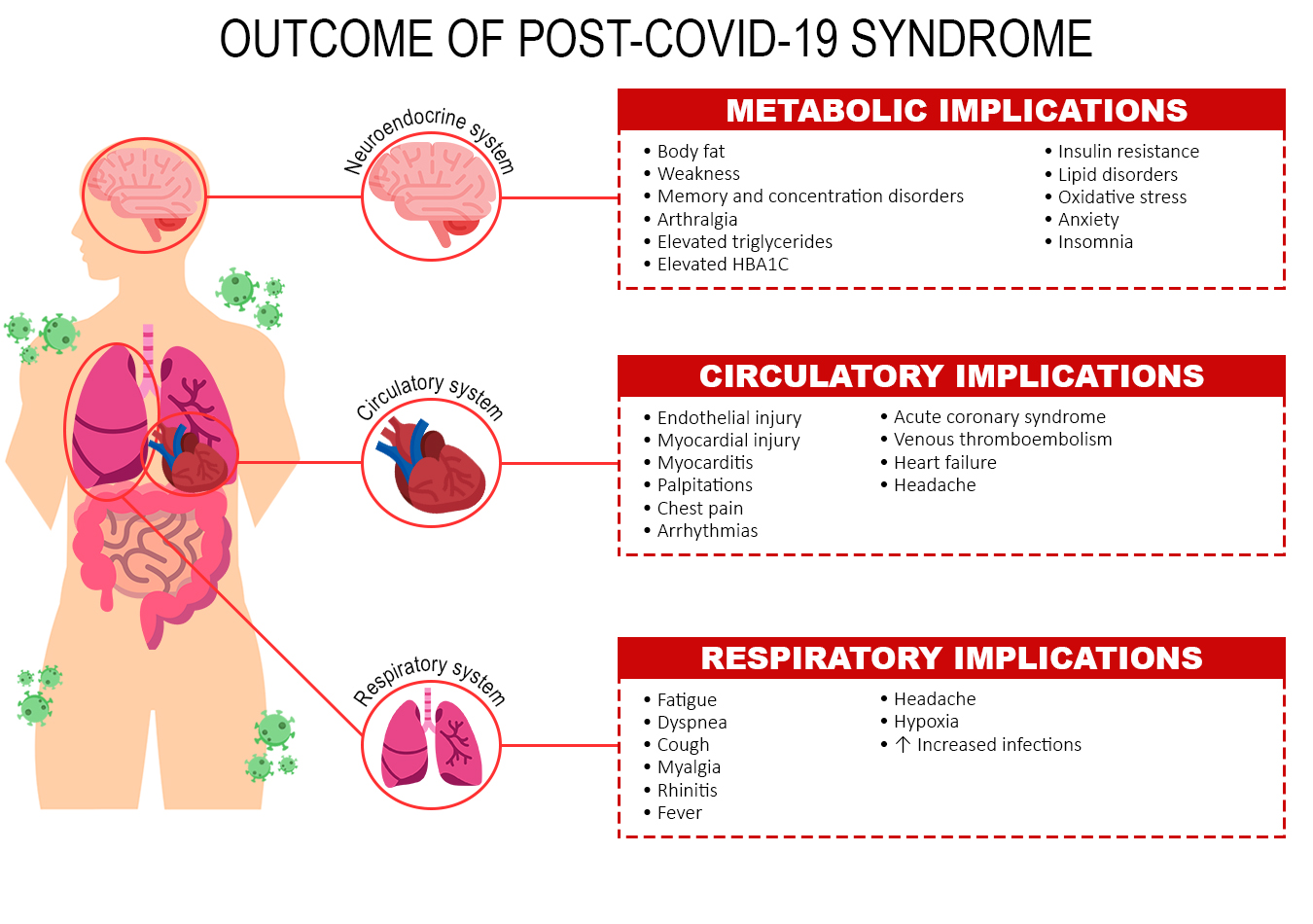 Residual cardiovascular system disorders were noted after 6 to 12 weeks, such as fatigue, dyspnea, headache, cough, dysgeusia, fever, and dyspnea21,28,29 myalgia, rhinitis, and fever due to respiratory infections21,23 pulmonary thromboembolism, heart failure, stroke, coronary heart disease24,28-29, pulmonary embolism, atrial arrhythmia, and venous thrombosis22,24, and myocardial infarction23-24. Oxidative stress leads to high levels of fatty acids, MUFA, and low PUFA in the blood, which are associated with cardiovascular risks, metabolic diseases, and infections30. The relationship between the implications, factors, and outcomes are shown in Figure 2.