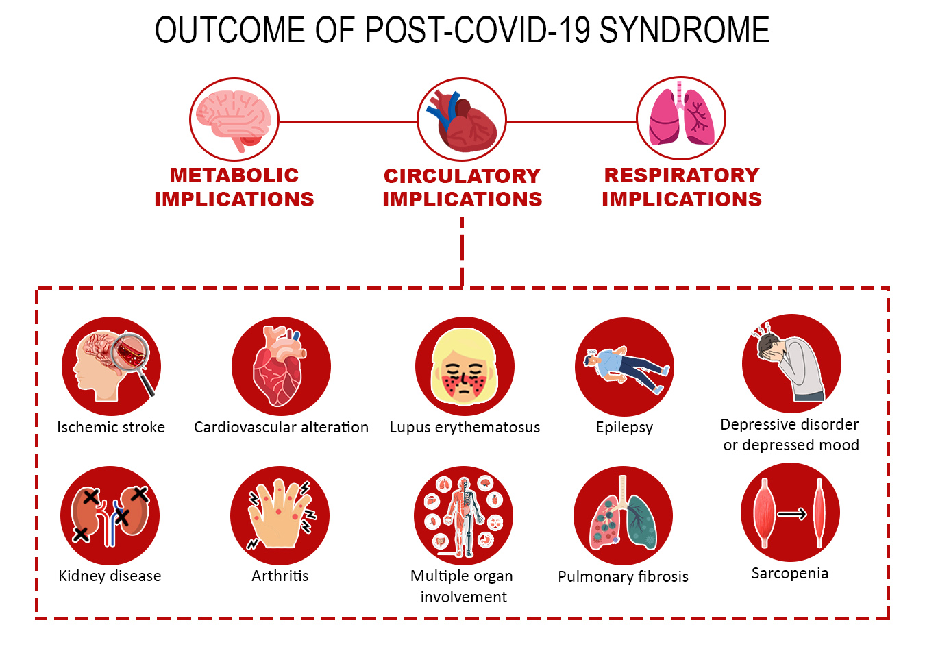 Cardiovascular consequences include increased resting heart rate, tachycardia, palpitations, hypotension, syncope, discontinuous flushing, orthostatic tachycardia, newly diagnosed hypertension, angina pectoris, and heart attack. In addition, it increases the risk of developing diabetes mellitus31. Long-term COVID can affect all patients with COVID-19 with severity, especially those with cardiometabolic diseases, and may have a worse outcome. There may be several clinical symptoms and manifestations, many of which are nonspecific and have an uncertain epidemiology.
