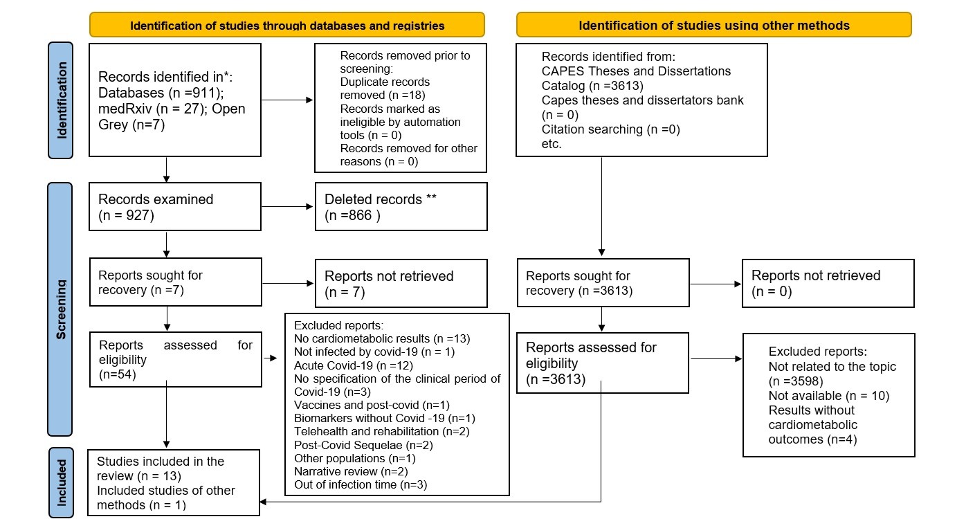 As limitations, there is a lack of studies involving the implications of cardiometabolic factors after long-term COVID-19 on health. The uncertainties arising from the advances in the clinical picture led to the need for periodic reviews of the topic. The process of searching and selecting studies may have omitted potential studies from the sample that did not contain expressions in the title or abstract of the content that answered the research question.