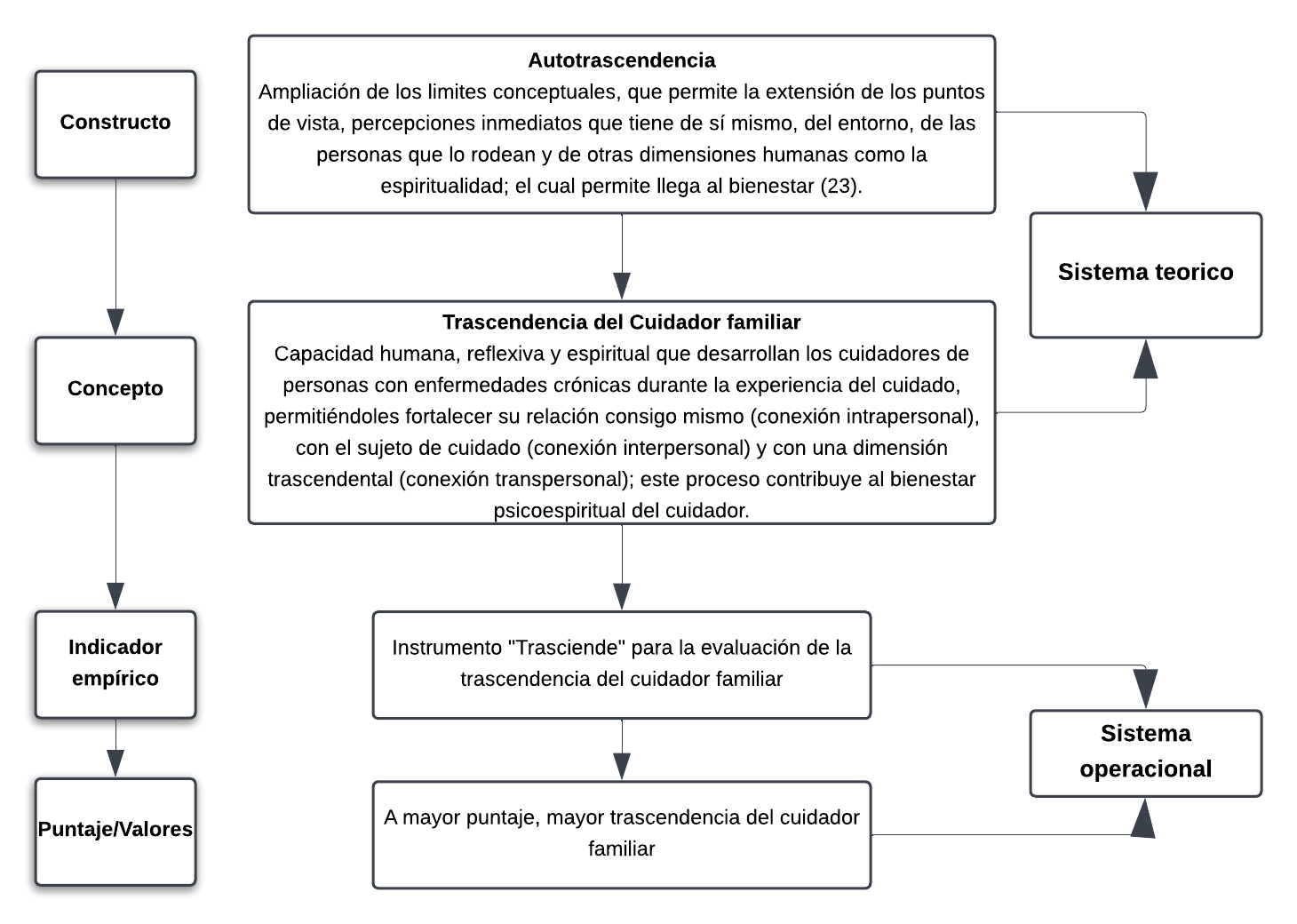Para medir un fenómeno, ese esencial contar con una definición conceptual clara y precisa, para ello debe haber una operacionalización conceptual, la cual es el proceso de delinear como se medirá el concepto en términos de indicadores observables asociados a él, mediante dimensiones o sus atributos43. Para este proceso se realizó una fundamentación conceptual según Dulock y Holzemer44, a partir del concepto de Autotrascendencia de la teoría de autotrascendencia de Pamela Reed23 (Ver Figura 2).