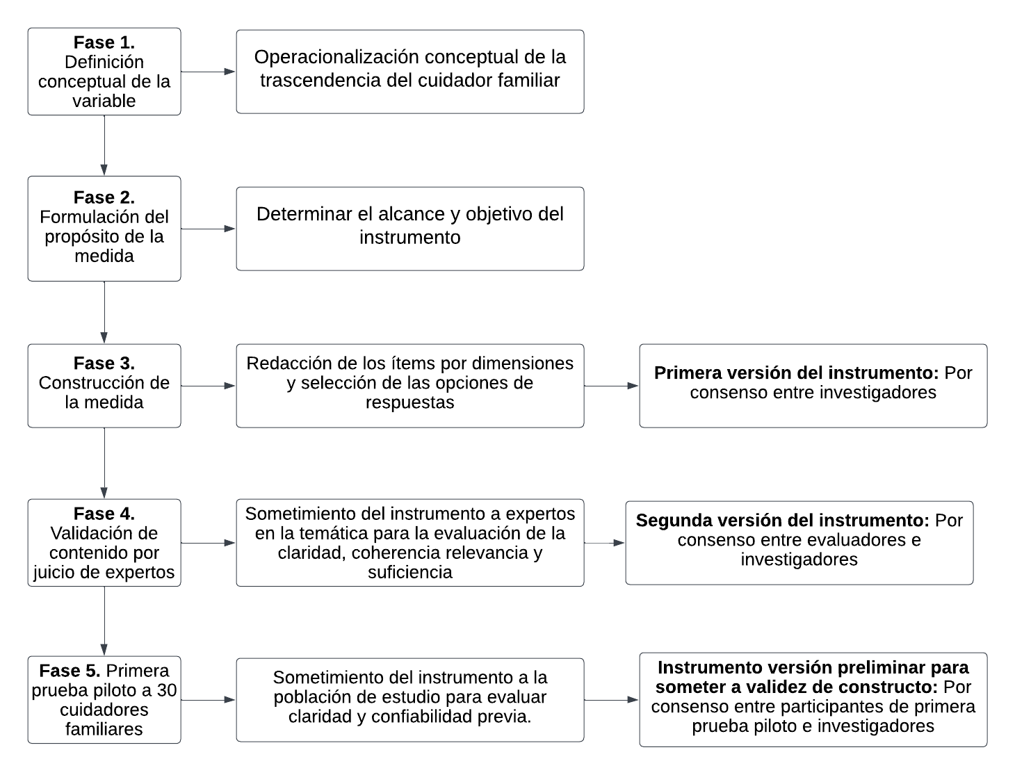 Estudio metodológico centrado en el diseño y validez de contenido por juicio de expertos de un instrumento de medición de la Trascendencia del cuidador familiar llamado “Trasciende” a partir de la metodología propuesta por Waltz43. Se llevaron a cabo cinco fases en este estudio, los pasos se detallan en la Figura 1.