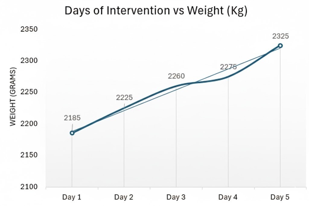 The intervention was conducted over five consecutive days, with each phase lasting five minutes. Daily weight measurements were documented. Figure 1 illustrates the daily weight gain, showing the initial weight of 2185 g and a progressive daily increase, with no decrease at any point of the intervention. By the final day, the newborn’s weight reached 2395 g, representing a gain of 210 g, equivalent to a 9.61% increase from the initial weight and a growth rate of 17.53 g/kg/day. According to the Fenton growth chart, this value corresponds to an adequate weight for gestational age (50th percentile). The intervention thus demonstrated a weight gain consistent with that expected for premature neonates hospitalized in a NICU9. Furthermore, the growth velocity during the intervention (17.53 g/kg/day) exceeded that recorded during the 40 days preceding the intervention (15.38 g/kg/day).