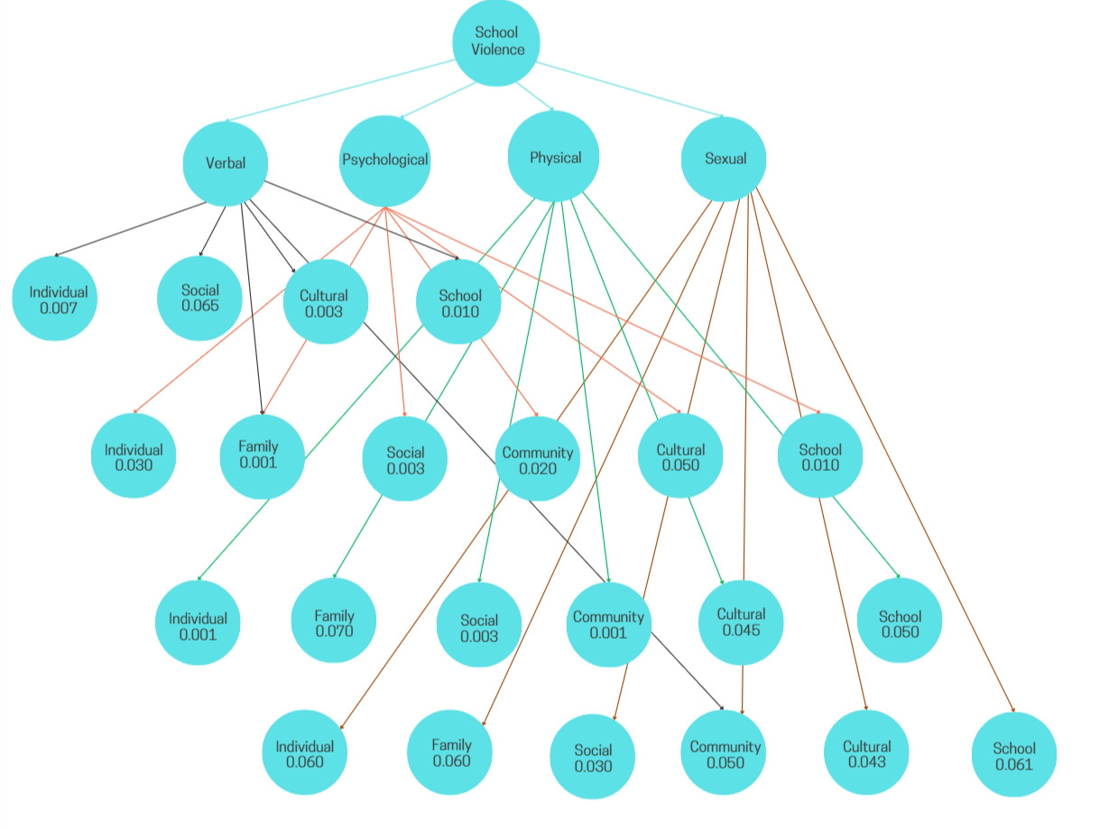 Building on the previous findings, various types of school violence were significantly associated with different contextual factors. Verbal violence was associated with individual (p = 0.007), family (p = 0.001), cultural (p = 0.003), and school-related (p = 0.010) factors. Psychological violence was linked to individual (p = 0.030), family (p = 0.001), social (p = 0.003), community (p = 0.020), and school-related (p = 0.020) factors. Physical violence showed associations with individual (p = 0.001), social (p = 0.002), and community (p = 0.045) factors. Lastly, sexual violence was associated with social (p = 0.030) and cultural (p = 0.043) factors. (See Figure 1).