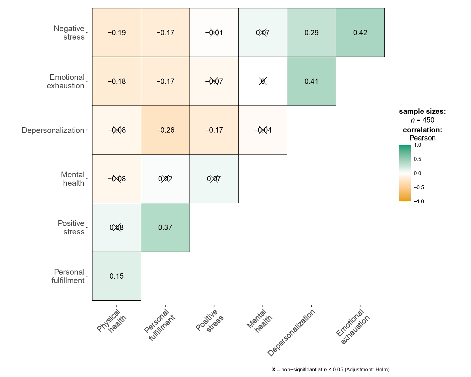 The highest arithmetic mean (M) was observed for personal accomplishment (M = 27.19), while the lowest was for depersonalization (M = 2.09). For standard deviation (SD), the highest value corresponded to personal accomplishment (SD = 5.98) and the lowest to physical health (SD = 1.67). Regarding the correlation matrix among the psychological variables, significant and non-significant correlations were found, with different effect sizes ranging from small to very large (Figure 1).