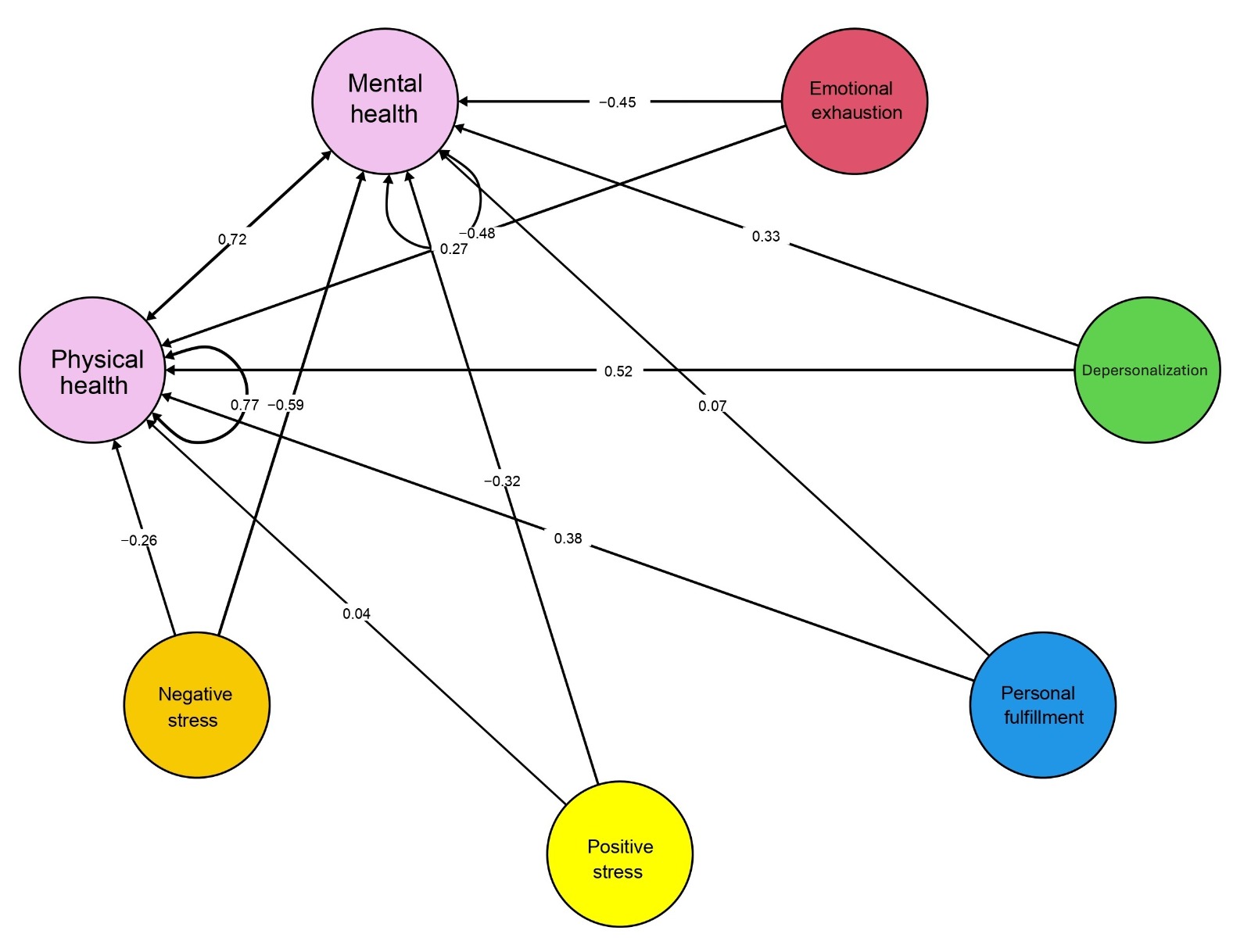 For physical health, no statistically significant regression model was identified. However, emotional exhaustion (β = -0.48, p = 0.21) and negative stress (β = -0.26, p = 0.22) were identified as non-significant negative predictors, whereas depersonalization (β = 0.52, p = 0.37), personal accomplishment (β = 0.38, p = 0.09), and positive stress (β = 0.04, p = 0.80) appeared as non-significant positive predictors (Figure 2).