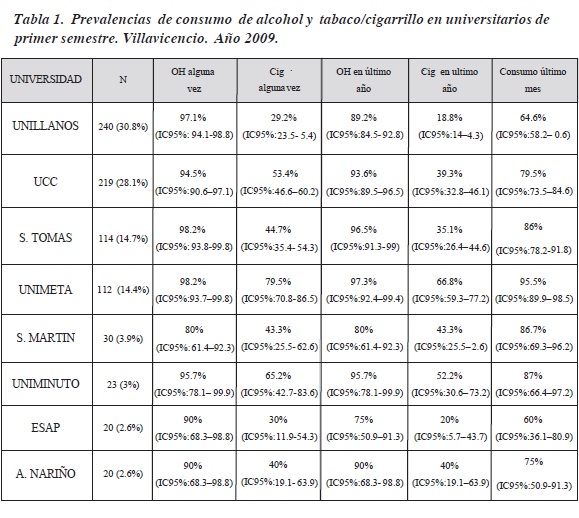 La prevalencia de consumo de alcohol en algún momento de la vida en la población universitaria de Villavicencio se sitúa en el 95.6% (IC95: 93,9%96,9%; DE: 0.21); el 72.2% iniciaron el consumo entre los 16 y los 18 años. Mientras que la prevalencia de consumo de cigarrillo en algún momento de la vida en la población universitaria de Villavicencio se halla en el 47.4% (IC95: 43,9%51%, DE: 0.49); el 34.5% de ese consumo se inició entre los 14 y los 18 años.