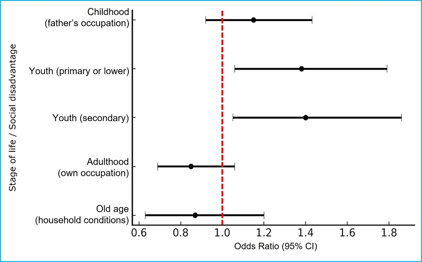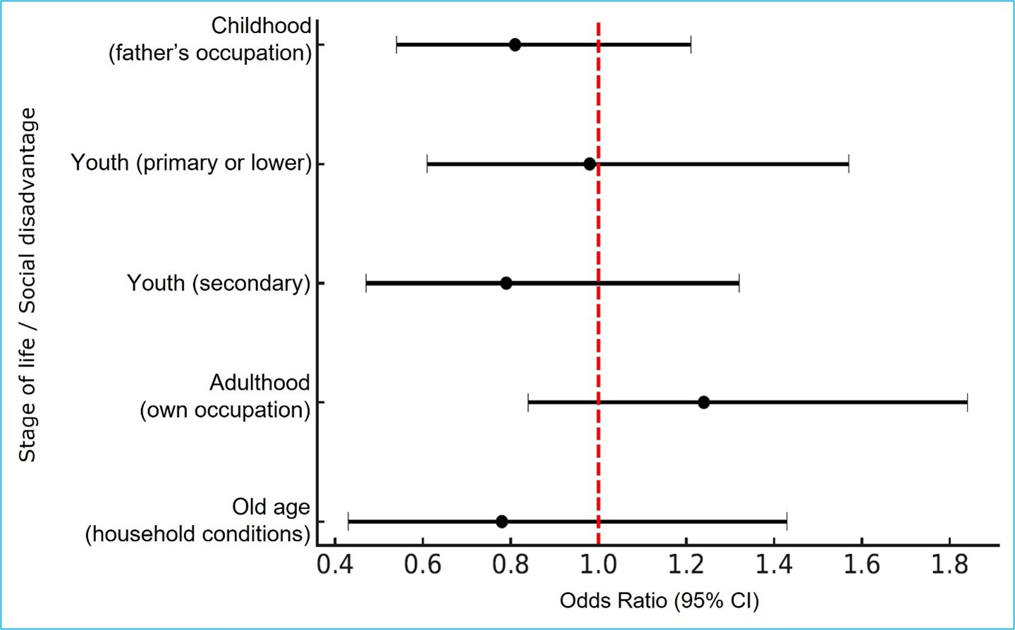 Additionally, no significant association was observed between lifelong social disadvantage and falls requiring medical attention Table 5 and Figure 2.