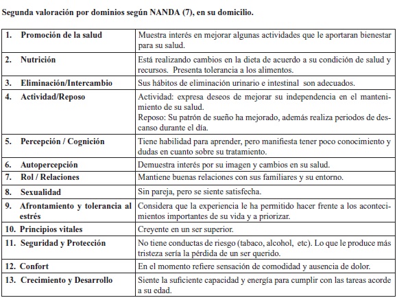 Una vez encaminada en práctica el plan de cuidados y el establecimiento de metas acordadas con el paciente, el establecimiento de los indicadores de resultados para el diagnóstico permitió crear un sistema de monitorización que nos ayudó a evaluar de forma objetiva las situaciones a mejorar, lo anterior está representado en los cambios de la puntuación Diana inicial en contraste con la final.