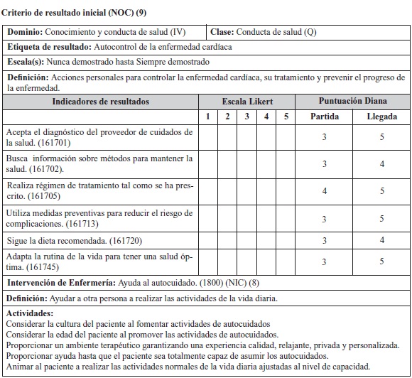 Introduction: Acute myocardial infarction cardiovascular disease is often triggered by various causes, it is considered that the cardiovascular risk factors are decisive in its onset and outcome after the event occurs. The greatest tool you have is the prevention of factors that influence the adoption of healthy lifestyles. Therefore, the nurse should promote health as a pillar in the way necessary to achieve a quality of life in people. Materials and Methods: Case report of a patient of 65 years who came to the emergency department in a health institution in the city of Bucaramanga (Santander) was applied NANDA nursing diagnoses and their classification domains. Results: The case allowed an analysis of the patient's health status based on a methodology that fosters results according to the needs of the individual. Discussion and Conclusions: At the end of the analysis showed the importance of applying a methodology to propose optimal nursing care and effective results.