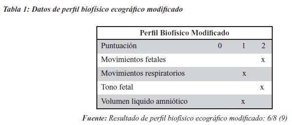 Usuaria con 30 años de edad, procedente del municipio de Floridablanca (Santander, Colombia) arquitecta, asiste a la unidad Materno Infantil por control de Ginecobstetricia donde se ordena ecografía obstétrica la cual reporta, una edad gestacional de 39 semanas; feto de presentación cefálica dorso izquierdo, frecuencia cardiaca fetal 152 por minuto, placenta con implantación grado III/IV; con perfil biofísico de 6/8 (ver tabla 1) presentando oligoamnios. A la valoración física gestante en adecuadas condiciones generales con patrón respiratorio espontaneo, senos blandos, secretantes con pezón evertido; abdomen grávido con altura uterina de 32 centímetros, dilatación de 1 centímetro, borramiento del 40%, membranas integras con amenorrea. Se traslada a cirugía para extracción de productode sexo masculino con presentación cefálica, peso: 2927 gramos, talla: 58 centímetros, perímetro torácico de 35 centímetros con perímetro cefálico 34 centímetros, apgar: 8 al minutos, a los 5 y 10 minutos de 10.