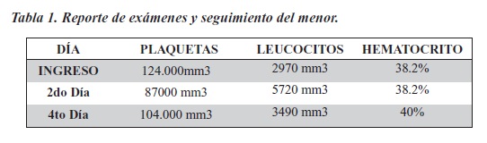 Al cuarto día de hospitalización el hemograma muestra aumento de plaquetas y disminución de hematocrito; sin presencia de signos de alarma, afebril y los resultados del hemograma evidencia aumento de las plaquetas y disminución del hematocrito por lo cual se concluye que la fase crítica de la enfermedad se ha resuelto y se decide dar salida al menor para continuar tratamiento ambulatorio con recomendaciones y control a los ocho días por pediatría.