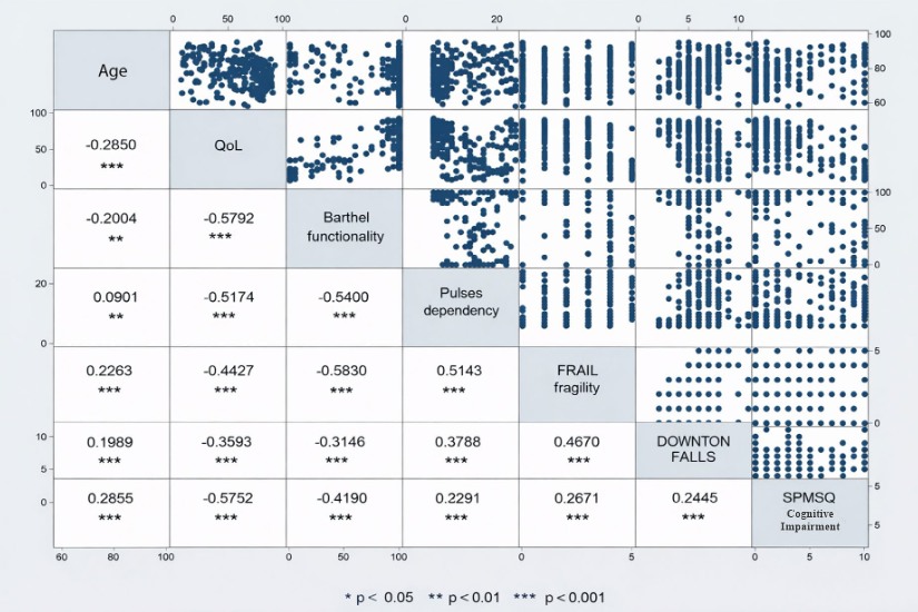 Estudo transversal analítico realizado com 250 residentes permanentes (≥3 meses) de um centro gerontológico em Bucaramanga, Colômbia. Foram incluídos indivíduos com 60 anos ou mais e com informante confiável; excluíram-se aqueles com doença terminal, transtornos psiquiátricos agudos ou instabilidade clínica. Foram aplicados os instrumentos: Escala FUMAT, Índice de Barthel, PULSES profile, escala FRAIL, Índice de Downton e Short Portable Mental Status Questionnaire (SPMSQ). Realizaram-se análises descritivas e bivariadas utilizando os testes Qui-quadrado, Fisher e Mann–Whitney. A análise multivariada foi conduzida por regressão logística binária. Os dados foram processados no Stata v17.