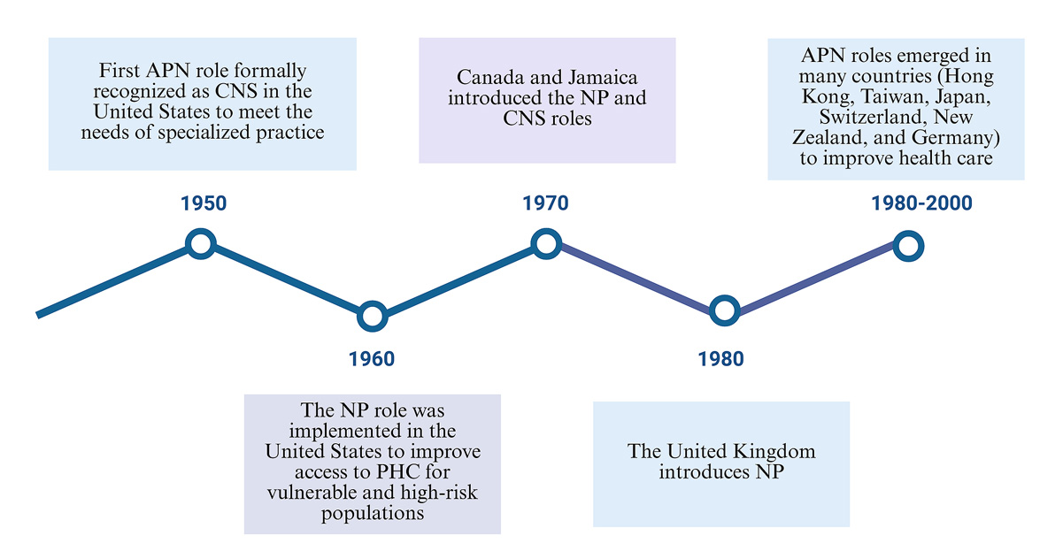 Advanced Practice Nursing (APN) originated in the United States in the 1950s as a response to emerging healthcare needs. Its inception focused on improving child health indicators in the rural and hard to-reach areas of Colorado. To achieve this, the development of APN involved training nurses to expand their autonomy, allowing them to provide comprehensive primary health care. This included advanced competencies such as diagnosing conditions, prescribing treatments (including medications), and a focus on health prevention and promotion, surpassing the traditional competencies of nursing1. Figure 1 for the introduction of APN over time.