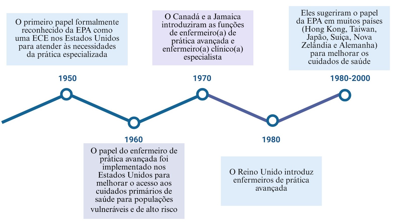 A Enfermagem de Prática Avançada (EPA) surgiu nos Estados Unidos na década de 1950 como resposta às necessidades de saúde. Sua origem concentrou-se na melhoria dos indicadores de saúde infantil em áreas rurais e de difícil acesso do Colorado. Para alcançar esse objetivo, o desenvolvimento da EPA envolveu o empoderamento dos enfermeiros para expandir sua autonomia, permitindo-lhes fornecer cuidados primários abrangentes. Isso incluiu habilidades avançadas, como diagnóstico de doenças, prescrição de tratamentos (incluindo medicamentos) e foco na promoção da saúde e prevenção de doenças, indo além das competências tradicionais da enfermagem1. Veja a Figura 1 para a introdução da EPA ao longo do tempo.