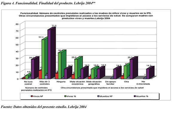 *Funcionalidad. Finalidad del producto. Numero de controles prenatales realizados a las madres de los niños vivos y muertos. Otras circunstancias presentadas a las mismas durante la gestación, parto, posparto y atención del recién nacido en la IPS de atención inicial y en el lugar del parto. Se comparan madres con productos vivos y madres con productos muertos. Lebrija 2004.
