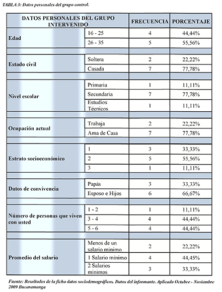 Por su parte, los datos sociodemográficos del grupo control en cuanto a las edades de las gestantes se encuentra que predomina entre los 26 a 35 años con un 55%; en cuanto a su estado civil la mayoría de las mujeres gestantes se encuentran casadas con un 77%. Al observar el nivel de escolaridad el mayor porcentaje tienen hasta la secundaria con un 77.7%. En cuanto a su ocupación actual de las mujeres gestantes en un 77.7% son amas de casa y un 22% trabaja fuera del hogar. Así mismo nos permite analizar en cuanto a su estrato socioeconómico la muestra en su mayoría 55.5% pertenecen al estrato 2, seguido de un 33.3% de estrato 1; su convivencia esta en un 66.6% con su esposo e hijos, con un número de personas entre 3-4 con un 44.4% seguido de 5-6 con un 44.4% y el promedio del salario predomina 1 salario mínimo con un 44.4%, seguido de 2 salarios mínimos con un 33.3%. Ver tabla n.3.