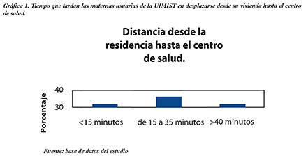 En la tabla 1 se observa que la mayoría de las maternas proceden de Bucaramanga (83%), son se religión católica (85%), el 64% tienen pareja, tienen educación secundaria (56%) y son amas de casa (68%). En la gráfica 1 se muestra la distribución de las maternas de acuerdo a cuánto tiempo gastan desde su hogar o residencia hasta el centro de salud, la mayoría de maternas, exactamente un 36% viven entre 15 a 35 minutos del centro de salud; sin embargo un 32% viven a 40 minutos o más del centro de salud, lo cual puede considerarse como una limitante a la hora de acceder a los servicios de salud de dicha institución.