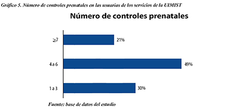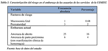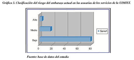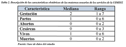 En la tabla 2 se observa que la mayoría de las usuarias de los servicios de la UIMIST han tenido 2 embarazos, un parto y un nacido vivo. Lo cual indica que posiblemente los servicios de mayor demanda son los ofrecidos a las gestantes como controles prenatales, monitoreos fetales, etc.