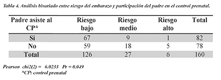 Se encontró asociación estadísticamente significativa entre el nivel de riesgo del embarazo actual y la participación del padre en el control prenatal, como se muestra en la tabla 4, es decir en hay mayor número de embarazos de bajo riesgo en las maternas que fueron acompañadas o hubo participación del padre en el control prenatal, lo cual sugiere que el acompañamiento en el proceso de gestación puede favorecer el adecuado curso de misma, por lo tanto, según estos hallazgos se recomendaría que las estrategias en atención prenatal se encaminarán a promover la vinculación y participación de la pareja en el desarrollo de la gestación.