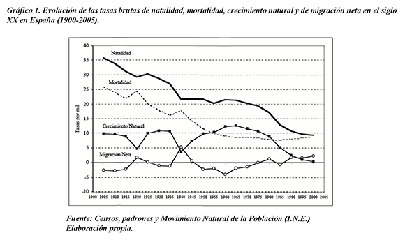 Como reiteran todos los análisis sociodemográficos sobre migraciones en menos de 20 años (1980-2000), España ha pasado de ser país de emigración a país de inmigración (21). Analizando más de cerca este fenómeno (Gráfico 1), vemos como a mediados de los años setenta del siglo XX España culminaba el paso de un modelo demográfico antiguo caracterizado por una elevada fecundidad, así como una alta mortalidad de tipo catastrófico. La inversión en el signo del saldo migratorio a mediados de esta década debido a las corrientes emigratorias, más el efecto combinado de un notable retomo de antiguos emigrantes españoles y los primeros flujos de inmigración internacional con destino a España, se confirmó con el sustento casi exclusivo de la inmigración extranjera en la década de los ochenta, para acelerarse en los noventa, convirtiéndose en uno los fenómenos impulsores del crecimiento de la población española en la primera década de siglo XXI.