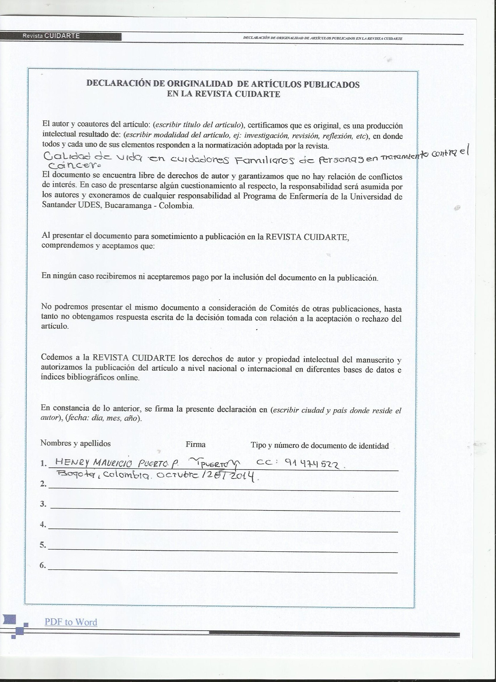 Cómo citar este artículo: Puerto HM. Calidad de vida en cuidadores familiares de personas en tratamiento contra el cáncer. Rev Cuid. 2015; 6(2): 1029-40. http://dx.doi.org/10.15649/cuidarte.v6i2.154